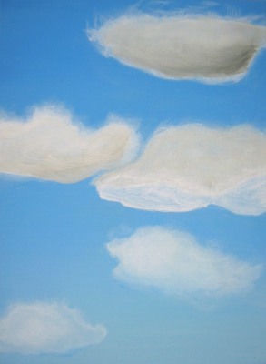 Bon, histoire donc de faire quelque chose avec cet essai r�ussi de ciel nuageux, et de profiter d'un cours "sp�cial pommes" du samedi apr�s-midi, Brigitte imagine d'y poser une pomme, fa�on Magritte. Avouons qu'en premier lieu, et � cause de ce nuage particuli�rement gris du haut, elle avait pens� un moment d'y faire flotter une douchette... et puis voil�, �clair de g�nie : |