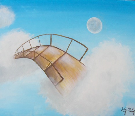 Un tableau commencé par le grand frère (un pont de bois assez bien dessiné d'ailleurs, mais laissé inachevé sans paysage ) est réutilisé en quelques minutes avec charme par Emeline : elle installe deux nuages de part et d'autre, équilibre la composition avec une lune. |
