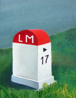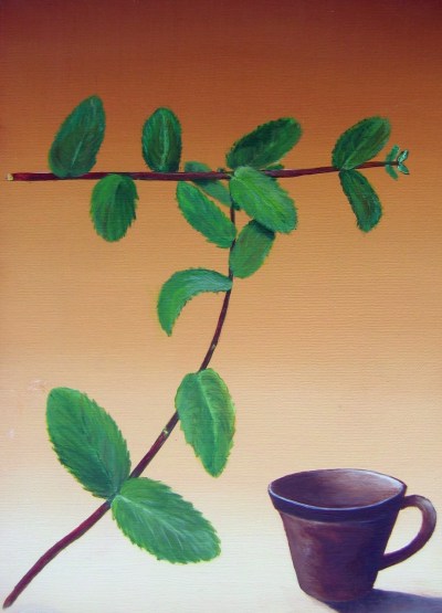 Premi�re peinture de la saison, sur le th�me commun � tous pour la rentr�e 2006 : les plantes dites m�dicinales. Le T � la Menthe acrylique sur toile, 27x 46 cm |
