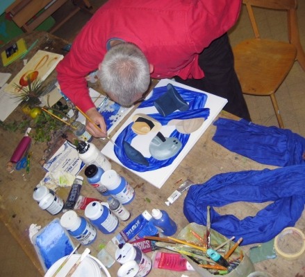 passion, la magie... (le chapeau haut de forme) Sont r�unis ici pas mal de difficult�s, (plis de tissus, perspectives, effets de mati�res, sable etc...) et Jean Pierre s'en sort bien, aid� d'une d�termination d'acier tremp�, et d'une humeur joviale qui fait si grand bien � notre s�ance du jeudi soir ! Vraiment bien pour quelqu'un dont c'est ici ses premiers pas en peinture, n'est ce pas ?