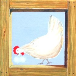 Mon triptyque poules, 2005 : Deux carrés 30 x 30 cm et un carré 60 x 60 cm. Effet de cadre en bois en trompe-l'œuil. |