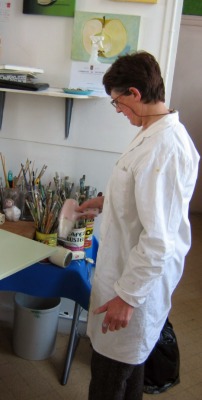 Odile et sa peinture d'Iris, pour le festival du Chateau d'Auvers sur Oise, mai 2006 (Voir la page)
