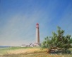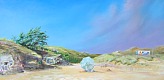 Du 1 au 18 juillet 2004, nous étions à Tibain, commune de Locmaria. Au contraire de l'année dernière, où ma palette se satura de bleu presque méditérranéen, cette année plutôt grisaille, bruine, vent... j'ai quand même pas mal travaillé sous le parapluie, aux bord des routes, et mon point de chute favori, vers les 19h, était le café et l'église de Locmaria, celle-ci très insolite avec son palmier, son toit en poivrière, son ambiance espagnole ! Les touristes planqués dans leurs logis, je rencontre avec plaisir les vrais belle-ilois, en vélo, à pied, à cheval... et aux comptoirs... |