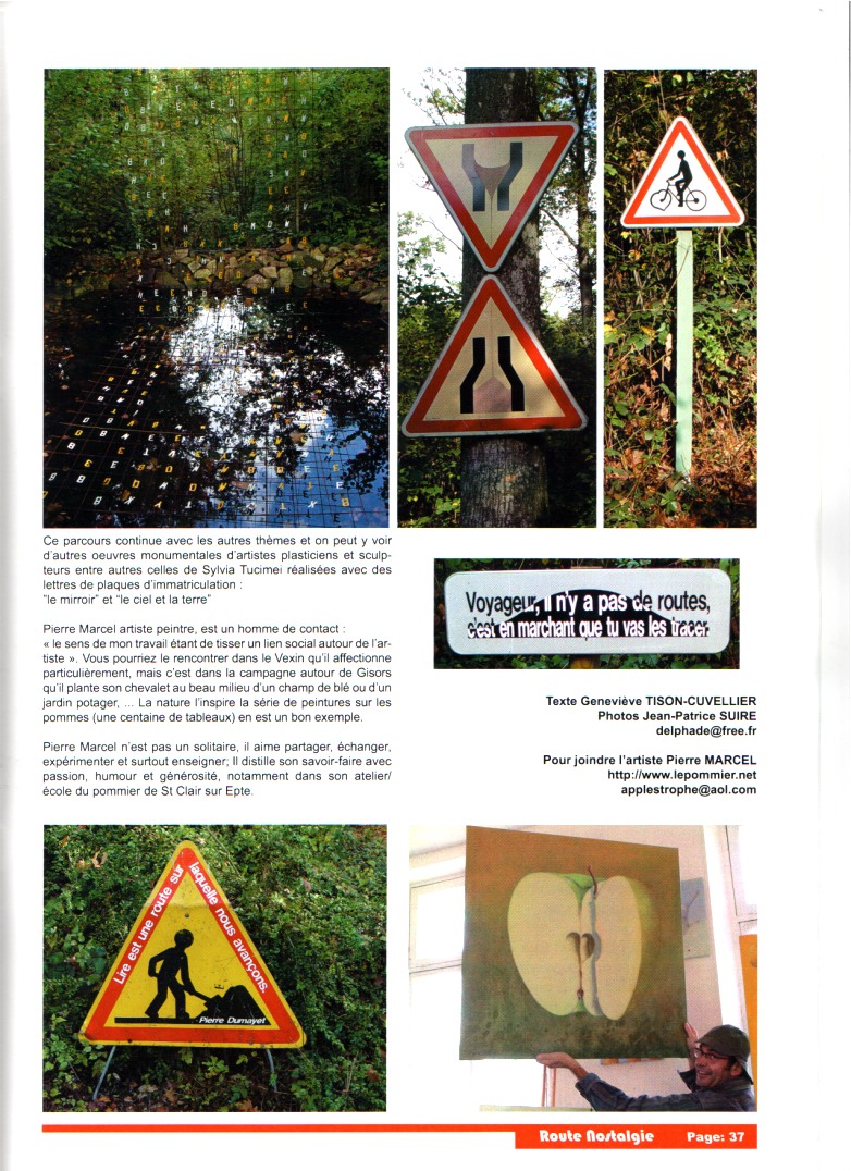ROUTE NOSTALGIE , Janvier 2007, numéro 15 ATTENTION DETOURNEMENT DE PANNEAUX Flagrand délit de détournement de panneaux, ou la signalisation routière revue et corrigée par Pierre Marcel Texte Geneviève TISON-CUVELLIER Photos Jean-Patrice SUIRE http://routenostalgie.free.fr/numeros/couvn15.htm Voir ci-dessous reportage réalisé par le magasine Route Nostalgie sur l'exposition panneaux détournés Pierre Marcel à l'occasion de l'édition 2005 de Art'hieul. Le document PDF communiqué par Route Nostalgie est de meilleure qualité que les pages html ci-dessous. Cliquer ici pour le consulter. |